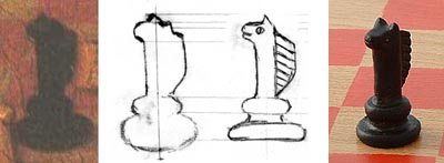 The game in the foreground turns out to be no mere prop, but an instructive presentation of the game itself. Studying the picture carefully, we see that each piece is deliberately represented, some more than once, and some at various angles. After analyzing the position and the identities of the pieces, and comparing the various renditions of each piece, we have selected a representative of each one, imagined it as a whole piece, defined what its form and measurements must have been – and finally reconstructed it as faithfully as possible. The result is a chess set so true to the painting that one can imagine the painting was made from these very pieces. One can step right into the painting and play the game. The pieces in the painting:sketches defining the forms: